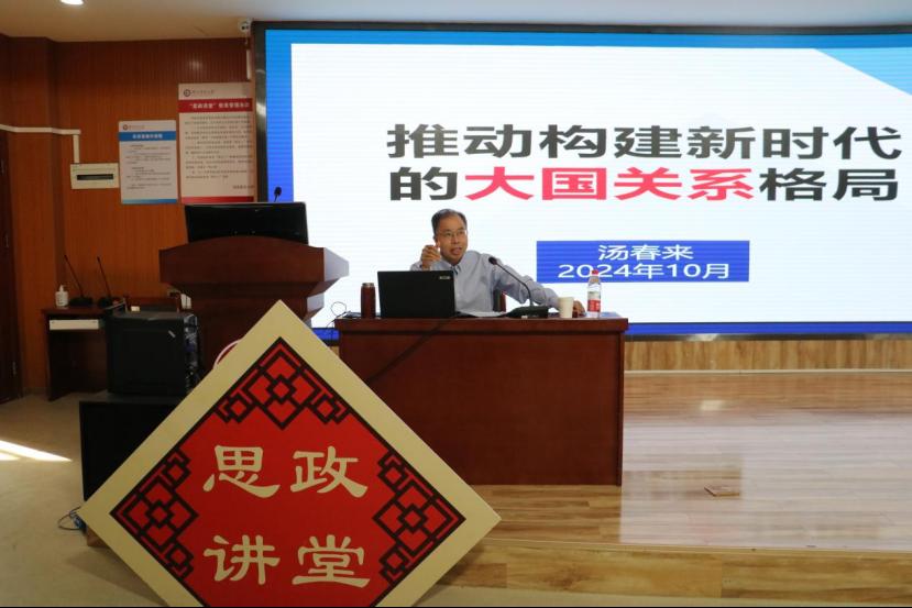 汤春来以“推动构建新时代的大国关系格局”为主题,用生动鲜活的语言,丰富的案例,并结合时事和数据,以中外对比等方式,深入浅出地从世界变局、国际对局、大国格局和中国开局等四个方面来进行讲解。当今世界正进入新的动荡变革期。百年大变局加速演进,乌克兰危机久拖不决,巴以冲突再起,世界经济增长动能不足,各种潜在风险挑战着世界的稳定与秩序,损害着人类安全、和平和繁荣的前景。面对动荡变革的世界,大国要如何应对?负责任的大国应该是什么样的?中国又是如何构建大国关系格局的?汤春来号召师生们既要有家国情怀,又要有国际视野,要好好学习专业技能,发挥自己的专业特长,为推进构建新时代的大国关系格局贡献自己的力量。