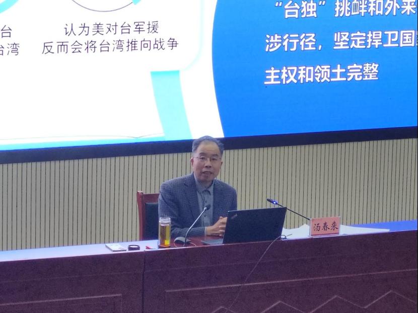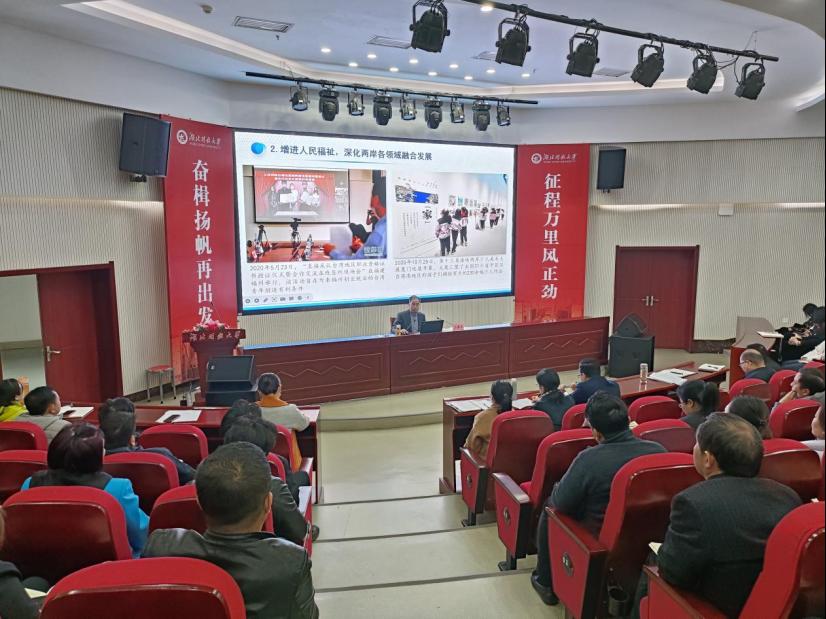 围绕“新时代党解决台湾问题的总体方略”,汤春来从历程回顾、内涵解析和实践要求三个方面详细讲解。他引经据典,用生动的语言,丰富的案例,先后回顾了新民主主义革命时期、社会主义革命和建设时期、改革开放和社会主义现代化建设新时期、中国特色社会主义新时代,中国共产党在推进祖国统一采取的一系列举措;并结合时事和数据,以中外对比、时空对比的方式,重点讲解了新时代党解决台湾问题总体方略的“十个坚持”和实践要求。
