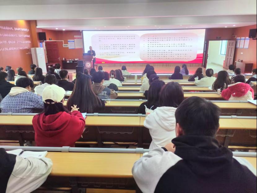 本网讯(通讯员 宋显 文/图)为进一步深入学习宣传贯彻党的二十大精神,着力用党的二十大精神统一思想、凝聚力量,引领广大青年学生自觉把思想和行动统一到党中央决策部署上来,着力提升理论水平,主动担当时代责任,立志做有理想、敢担当、能吃苦、肯奋斗的新时代好青年。11月24日上午,校党委常委张化斌为经贸学院2023级金融1、2班的学生讲授了一堂以“道的文化意义“为主题的思政课程。