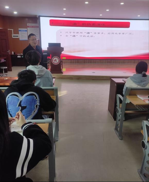 张化斌从“道”的历史演化、“道”的思想内涵、“道”的文化意义这三个方面深入浅出地为同学们阐述了中华优秀传统文化的指导意义及作用。他强调,“道”的思想内涵及文化意义对大学生的重要意义,他鼓励同学们要挖掘中华优秀传统文化的思想观念、人文精神、道德规范,将中华美学精神和当代审美追求结合起来,坚定文化自信和使命担当。