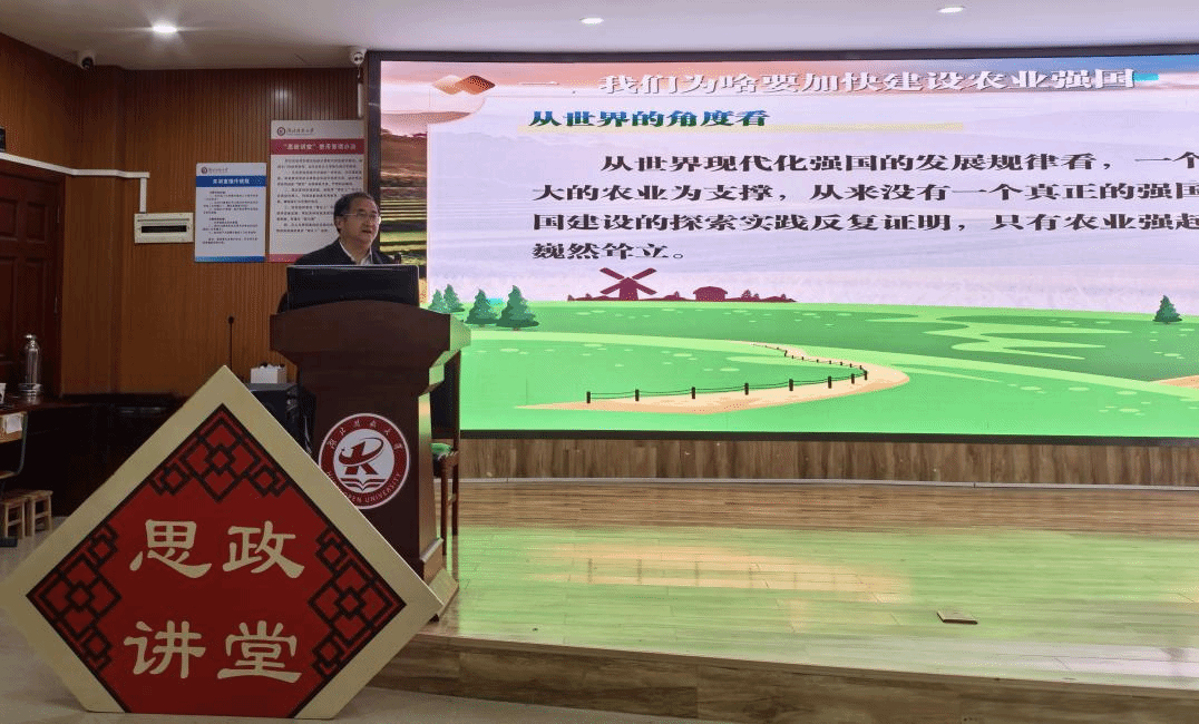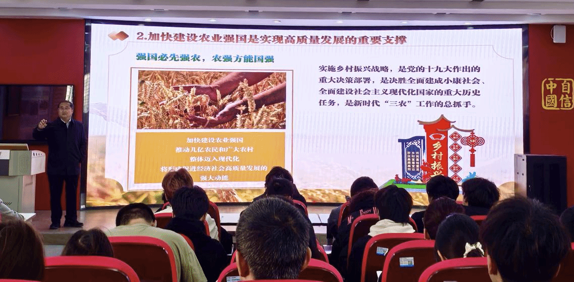 钟毓宁围绕“为何建设、建什么样、怎样建设”三个核心问题展开授课,专题解读了党的二十届四中全会精神,深入阐释“十五五”时期经济社会发展的谋篇布局与战略举措,阐释了党的二十届四中全会精神与农业强国建设的内在联系。他以草根网红凭借乡村生活短视频爆火、明星直播带货农产品助农等热门案例切入,引发学子对农业话题的关注与思考。他指出,这些现象背后,是大众对乡村风貌、优质农产品的热切关注,更是农业在新时代焕发的新活力。加快农业强国建设事关人民美好生活、事关产业高质量发展、事关国家安全根基。在建设目标上,他结合《加快建设农业强国规划(2024—2035年)》提出的“供给保障强、科技装备强、经营体系强、产业韧性强、竞争能力强”要求,解读了财经人才可参与农业资金优化配置、集体资产运营规范,计算机人才则能在智慧农业平台搭建、农业大数据分析、农机智能控制等领域发挥专长。围绕建设路径,他从夯实粮食安全根基、推进农业科技自立自强、完善现代农业经营体系、推进农业产业体系升级、深化农业对外合作等五个方面展开论述。