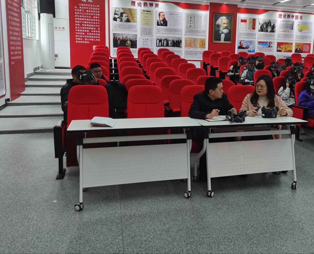 孙争元一行重点考察了我校大学生思想政治理论课体验式学习中心,现场佩戴VR设备体验了虚拟仿真实践项目,一行人高度赞扬了我校在思想政治理论课实践教学模式上所做的探索和实践,表示收获了有益经验,对于思政课信息化技术革新具有启发借鉴意义。