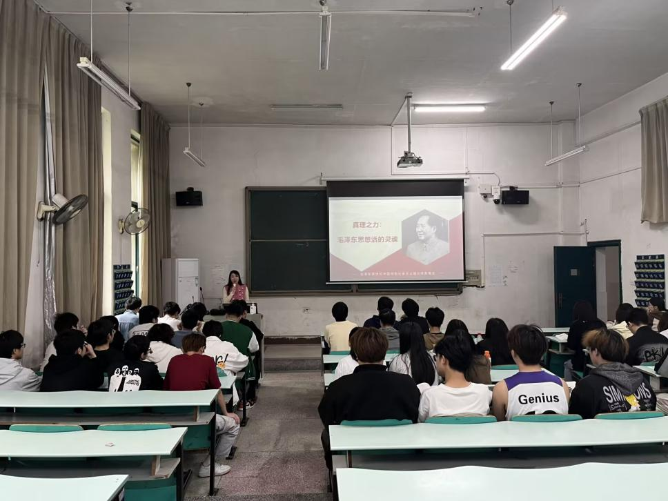 本次公开课由马克思主义中国化教研室龚灿老师主讲,她以真理之力——毛泽东思想活的灵魂为主题,围绕科学内涵、理论渊源、历史逻辑、现实逻辑四个层面展开,结合时事政治,联系学生专业前沿,阐明毛泽东思想永远是一面光辉的旗帜,坚持实事求是、群众路线、独立自主的原则是兴党兴国之本,是当代青年成长成才之基。让学生在学习党的理论,了解党的历史的过程中,深刻感受到党的丰功伟绩及理论的科学性,潜移默化地增强四个自信,自觉做到内化于心,外化于心,成为新时代四有好青年。
