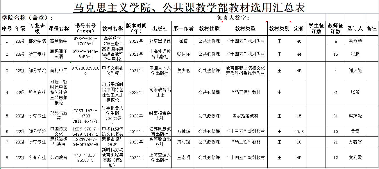 根据《关于开展2023-2024学年第一学期教材选用工作的通知》院部严格按照工作要求和选用程序开展了2023-2024学年第一学期教材征订工作。经相关教研室广泛征求意见并组织科学论证,课程负责人提出教材征订建议,院部教材选用委员会集体讨论通过,形成以下教材征订结果。