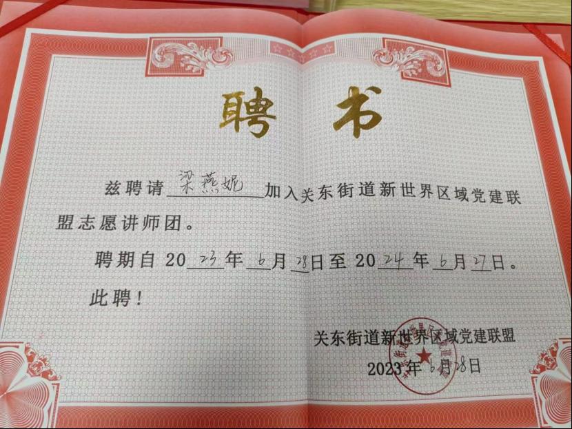 本网讯(通讯员 黄雷 文/图)5-6月,院部教工一支部党员教师梁燕妮同志多次下沉社区,为居民讲党课,并被聘为关东街道新世界区域党建联盟志愿讲师团的特聘讲师,开展重大主题宣讲、基层百姓宣讲等活动,自觉承担起举旗帜、聚民心、育新人、兴文化、展形象的使命任务,把厚重的理论通俗化,把深奥的道理浅显化,用讲故事、举事例、摆事实等方式解疑释惑,让理论宣讲更加温暖人心、更加具有力量。