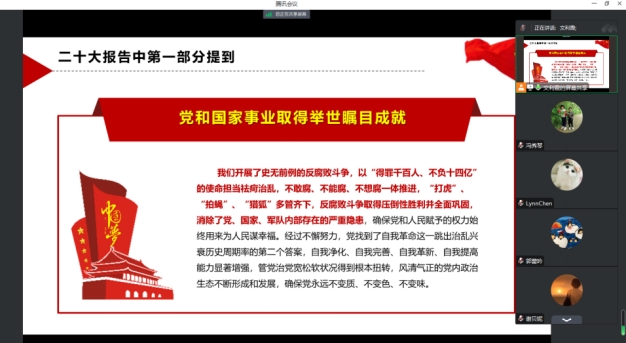 随后,党支部书记文利霞同志以“以党的二十大精神为指引推荐全面从严治党”为主题讲廉洁教育专题党课。她从党的二十大报告中关于全面从严治党的论述引出主题,随后从严肃党内政治生活、严抓正风肃纪、严惩政治腐败、严格追责问责四个方面阐述治国必先治党、治党务必从严。最后落脚到党员干部,应在思想上强化思想意识、在道德修养上做到“五慎”、在实际行动上把好“三关”,坚守底线,不越红线,做合格党员。