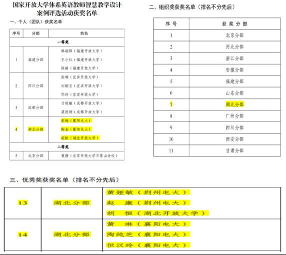 本网讯(通讯员 胡恒/文 陈玲/图)近日,国家开放大学体系英语智慧教学设计案例评选活动圆满收官。我校由省校和分部组成的英语智慧教学改革项目团队与来自全国兄弟院校数百名教师进行激烈角逐,经过教学方案设计、说课展示等环节的初评、复评及终评,最终获得1项一等奖、2项优秀奖与组织奖等荣誉。