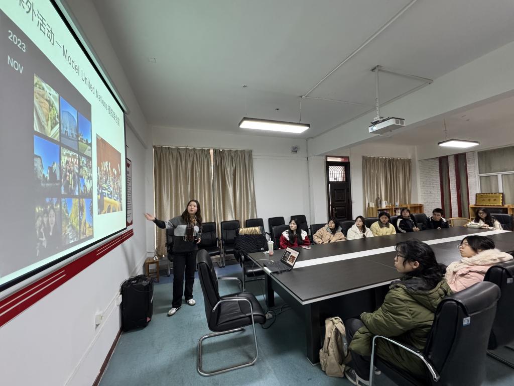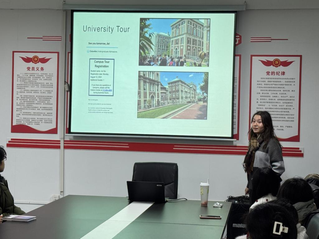 Jie Xia是库比蒂诺市LynbrookHigh School (San Jose)的高中生,她主要向来自各个学院的同学们介绍了当代美国青少年的学习生活及社会生活,并围绕中美教育差异、文化差异、英语学习方法及当今就业趋势等问题跟同学们进行了讨论和交流。