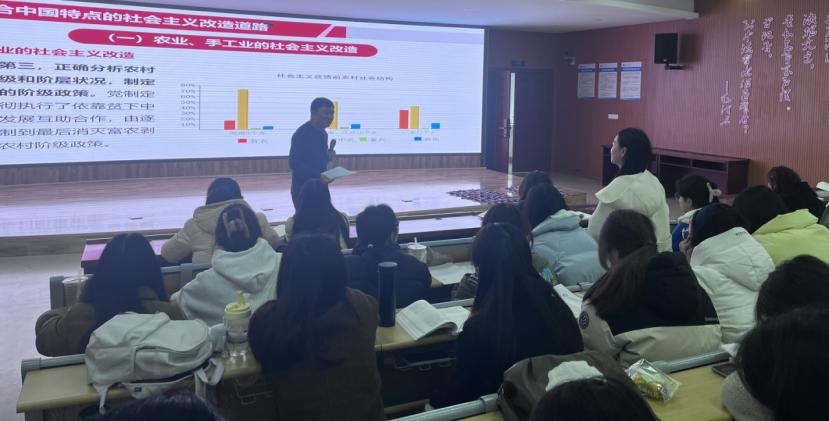 3月13日上午,刘源泉老师在2301教室为大家主讲了一堂《毛泽东思想和中国特色社会主义理论体系概论》课程公开课。刘老师以"适合中国特点的社会主义改造道路"为主题,通过沉浸式互动教学引导青年学生深刻理解中国共产党的历史主动精神。他首先通过“经典我来读”和“热点大家谈”两个环节激发学生的学习热情,导入本次课程的内容。然后,运用生动的案例、丰富的图表和详实的史料,讲述了农业、手工业和资本主义工商业改造的背景、政策、步骤和成果,引导学生从实践和理论两个层面分析政策背后的原因,并通过与学生互动交流的形式,辨析了易混概念,指导学生加深了对中国特色社会主义改造道路的理解。