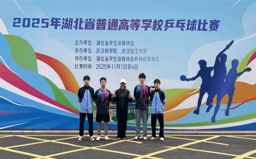 本网讯(通讯员 文淑斌 文/图)11月1日至4日,2025年湖北省普通高等学校乒乓球比赛在武汉商学院、武汉轻工大学举行。我校乒乓球队在王军力领队、文淑斌教练的带领下团结一心、发挥出色,最终荣获高职高专组男子团体赛季军,展现出卓越的竞技风采。