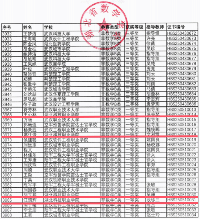 本网讯(通讯员 吴珊/文 冯秀琴/图)首次出征,载誉而归!近日,湖北省第十四届大学生数学竞赛成绩揭晓。我校组织30名学子参赛,斩获一等奖4名、二等奖6名、三等奖5名,获奖总数位列全省第四,一等奖获奖人数居全省第五,以亮眼的成绩实现数学学科竞赛征程的“开门红”。